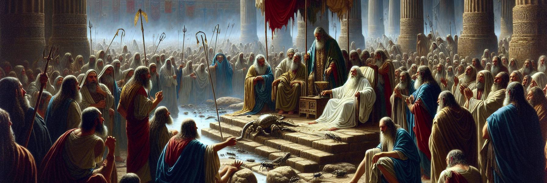 摩西和亚伦又来了。他们站在殿前广庭的石板上,影子拉得老长。这回,他们的脸上没有怒容,只有一种沉重的悲哀,仿佛他们带来的不是警告,而是一个早已预言、无人愿听的结局。摩西开口了,声音不高,却奇异地穿透了风声:“容我的百姓去,侍奉耶和华。你若不肯,明天,耶和华的手要加在你田间的牲畜上,就是马、驴、骆驼、牛群、羊群,必有重重的瘟疫。”
