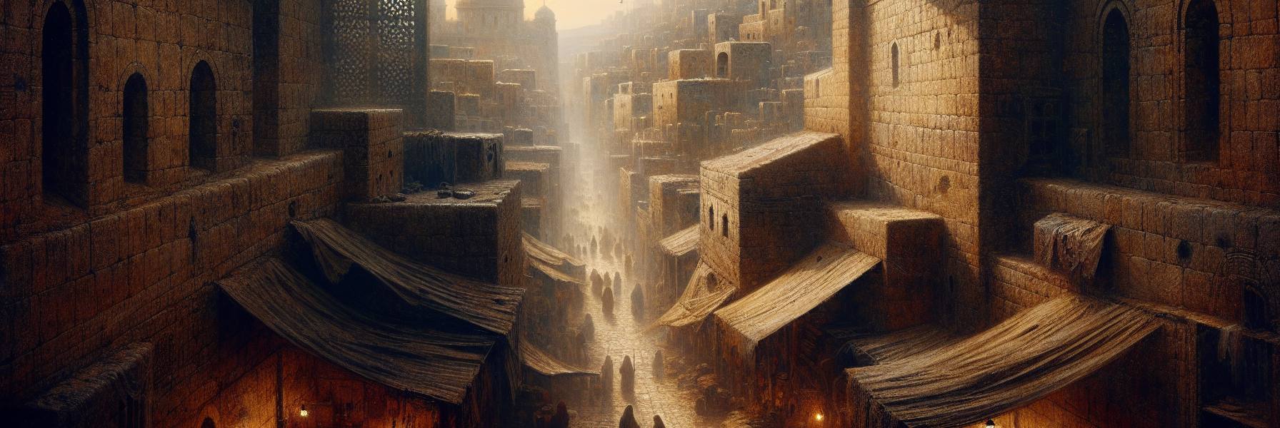 夜色像掺了墨的油,慢慢浸透了耶路撒冷的石板街巷。暑气尚未散尽,空气里浮着白日晒过的尘土味,混杂着某户人家飘出的烤饼香气。我坐在窗前,木窗棂被岁月磨得光滑,指尖能触到那些细微的凹痕。灯盏里的橄榄油剩下不多,火苗忽地一跳,墙上的影子便跟着颤动,仿佛也有了生命。