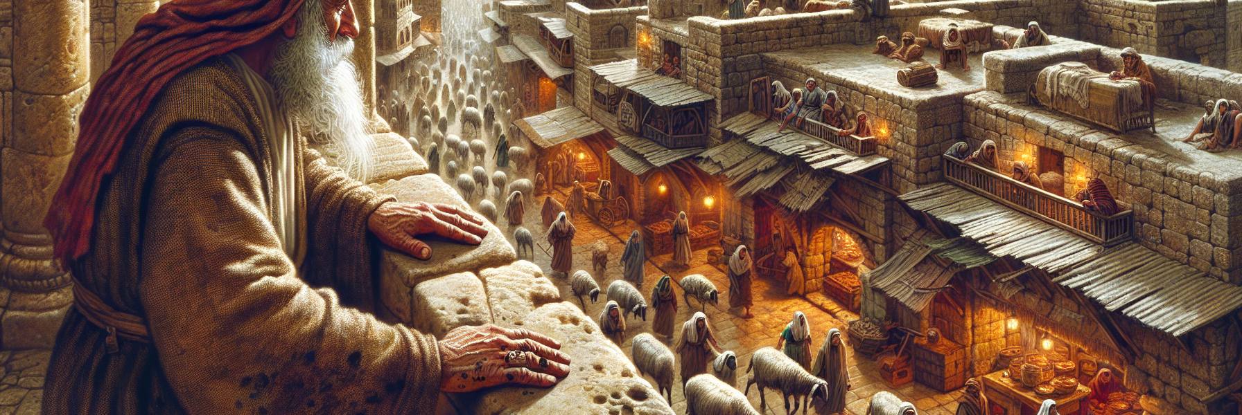 天色更暗了些,羊皮卷上的字几乎要看不清了。我起身,走进屋里,点了盏陶土的油灯。灯火如豆,晃晃悠悠的,把我的影子投在墙上,像个摇摆不定的巨人。我索性携了经卷,走到外面的街道上。傍晚的耶路撒冷,空气中飘着炊烟、烤饼和一种白日将尽的尘土气味。街市还未全散,小贩在收拾摊子,铜器的碰撞声叮当作响。几个罗马兵士挎着短剑,迈着整齐的步伐走过,靴子敲在石板上,声音又冷又硬。人们纷纷让开,低着头,等他们过去,才又恢复先前的活动,只是声音压低了许多。