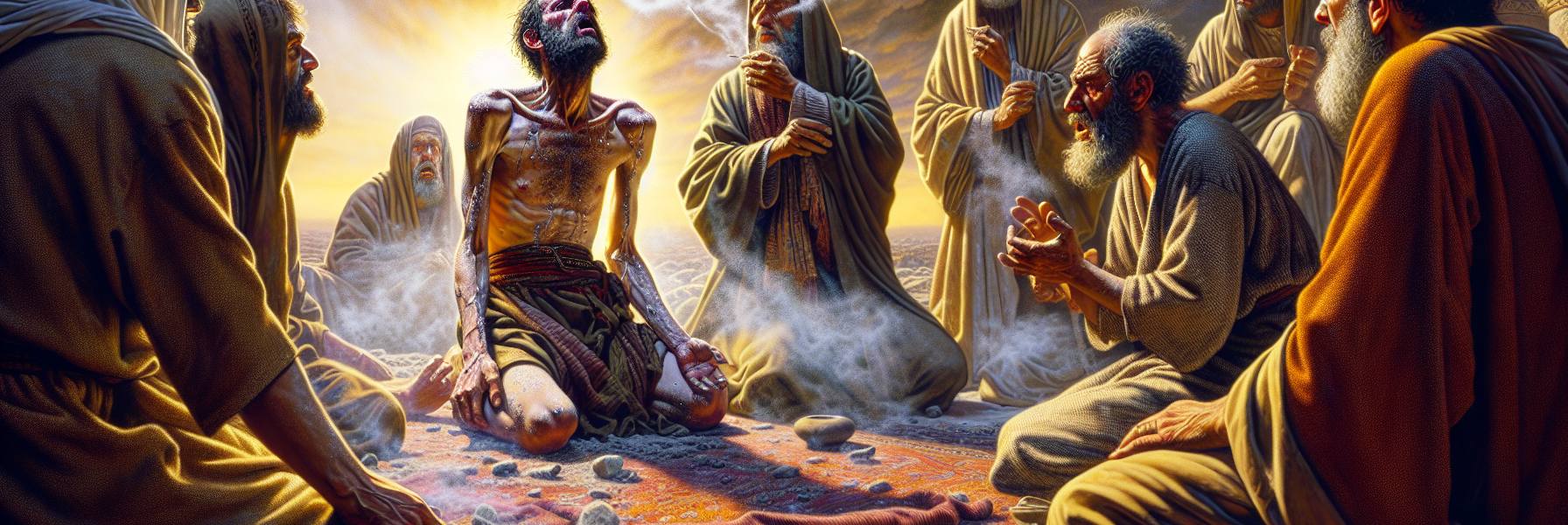沙漠的風吹過帳篷的縫隙,帶來細沙與乾燥的氣息。傍晚的熱氣開始退去,陰影拉長,像漸漸瀰漫的墨跡。老牧人比勒達坐在一塊磨光的石頭上,手裡無意識地捻著一根枯乾的駱駝刺。他的臉被歲月和風沙刻成深峻的溝壑,眼神卻像燧石般堅硬、明亮。圍坐在周圍的幾個年輕人,臉上還帶著未經苦難磨礪的焦慮與困惑。其中一個,目光頻頻投向遠處那座寂靜的、災禍籠罩的帳篷——約伯的帳篷。