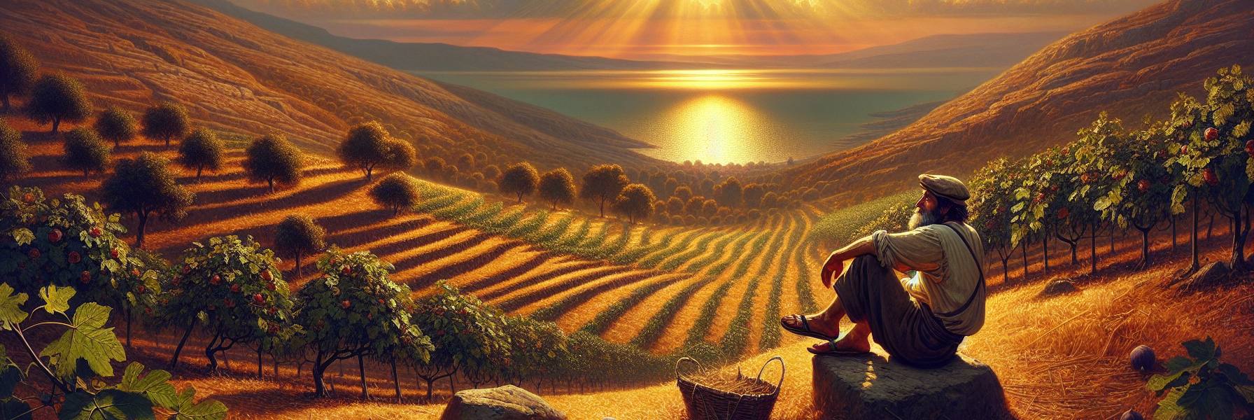 正午时分,我爬到山坡的高处。赭红色的岩石被晒得发烫,手贴上去能感到积蓄了一上午的热力。蜥蜴飞快地窜过石缝,留下一道细微的沙痕。从这里望下去,谷地全然展开:橄榄树聚成灰绿的团簇,麦田则是整片的金黄,风过时起伏如缓慢的呼吸。更远处,村庄的土墙泛着白光,炊烟笔直地升起,在无风的空中凝成淡淡的青灰色。