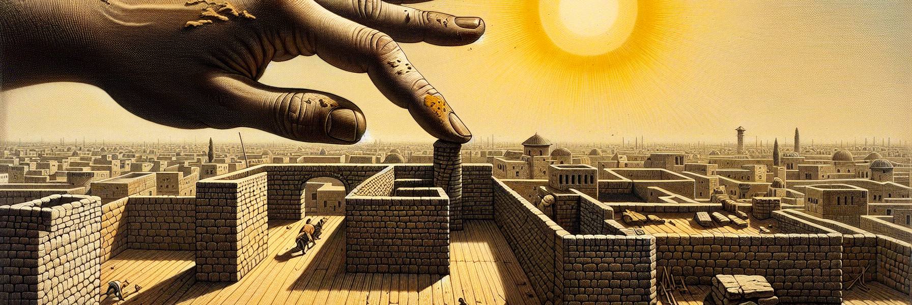 日子堆积如土。某一刻,他在半昏沉中,仿佛看见了耶路撒冷。不是记忆中圣殿的金碧辉煌,而是砖块上所画的、被铁围困的那座城。城内,百姓的面容浮肿,因饥饿而眼睛深陷。母亲的手颤抖着,掂量着最后一把麦粉。孩童的啼哭微弱下去。城墙外,敌军的身影如铁铸的森林,投下漫长的、死亡的阴影。这异象如此真切,让他几乎要抬手去触摸,却只碰到巴比伦干燥灼热的空气。