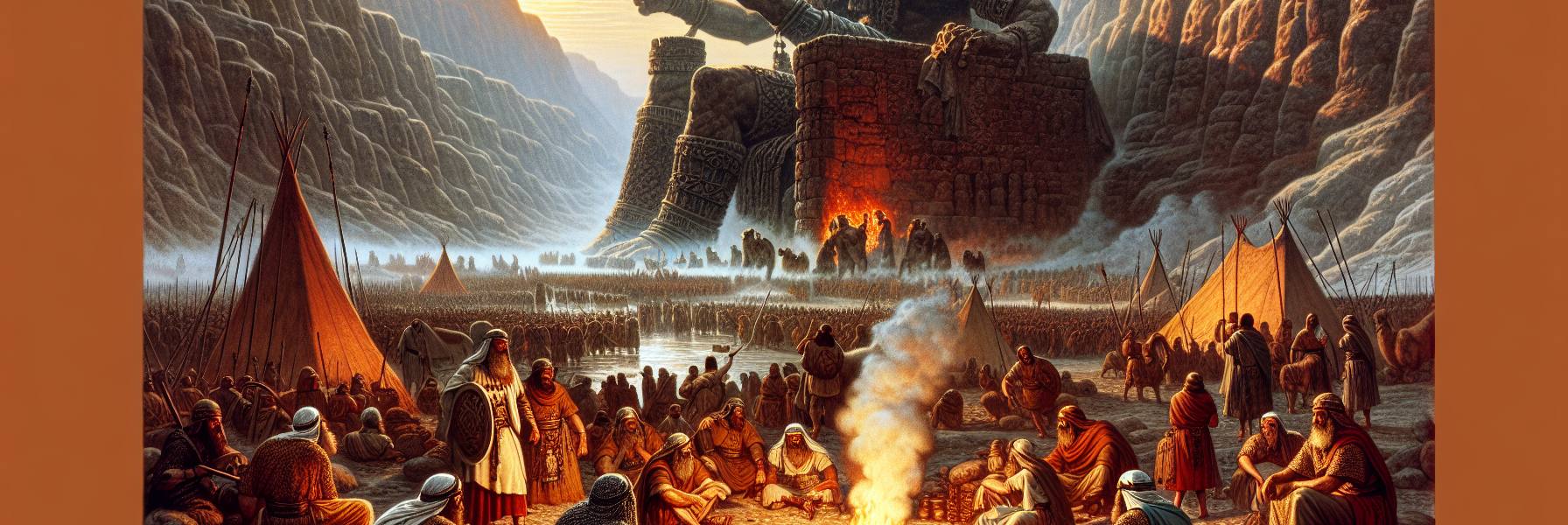巴珊,那是一片与众不同的土地。不是我们惯见的荒漠或矮丘,而是高地,坚实的、黑色的玄武岩山崖,像巨人沉睡的骨骼。噩的城邑,城墙高得不可思议,门是铜的,厚重得需要十个人才能推动。他的族人,利乏音人,传说中上古魁伟的族裔,身材高大,让你站在他们面前,会觉得自己像田间的蚂蚱。流言像旱季的热风一样在营中传开,带来恐惧。有人夜里辗转,梦见那些巨影。