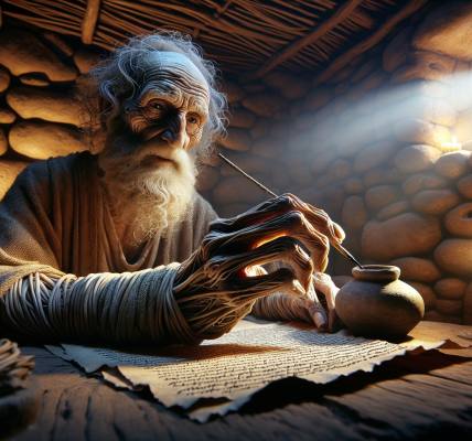 他走回自己的帐篷,没有点燃灯烛。他在黑暗中坐下,从怀中摸出一个皮袋,里面是摩西亲手交给他的律法书卷。羊皮粗糙的质感贴着他的手心。他没有打开,只是紧紧握着。