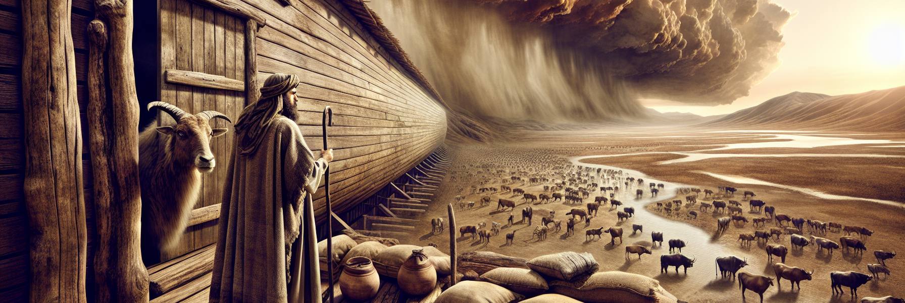 “父亲,都齐了。”闪走过来,他的声音在陡然呼啸起来的风里有些破碎。他的脸上还沾着给公牛上轭时蹭上的泥。挪亚只是点了点头,他感到一种深不见底的疲倦,不是来自这一百二十年砍伐歌斐木、锤击榫卯的辛劳,而是来自骨髓里的某种东西。他看着眼前这庞然大物——方舟,它像一座笨拙的、沉默的山,蹲踞在从未有过船只的旱地上。船身还散发着新鲜的松脂味,甲板在风中发出轻微的、吱呀的呻吟,仿佛这木头造的骨骼也在惧怕即将到来的事。