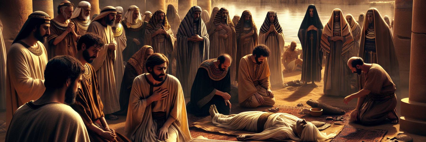 哀哭的日子長得彷彿沒有盡頭。埃及的術士與祭司們以精準的禮儀履行一切,刀割面頰的祭司,排成長列的職業哭喪者,他們的悲聲整齊劃一,卻進不到約瑟心裡。他心裡翻騰的,是另一種惶恐。父親不在了。那根維繫著、鎮壓著、調和著這個家族微妙平衡的巨柱,轟然倒塌。他聽見帳外哥哥們壓低的交談,偶爾幾個詞語碎片般飄進來:「……父親死了……」「……約瑟會不會……」「……從前的罪……」