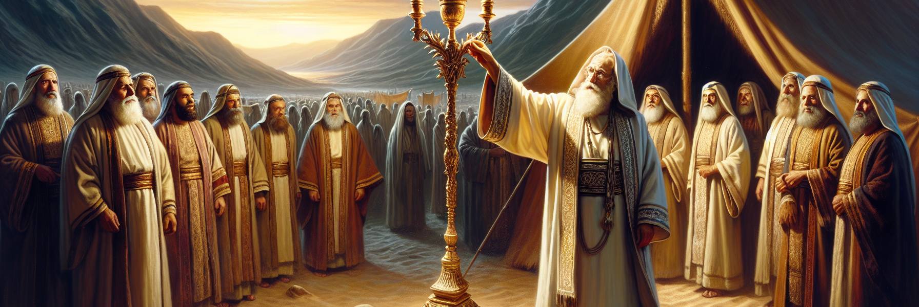 灯台是用金子锤出来的,这亚伦已经看过许多次了。但今天不同。今天,摩西站在会幕里,手指缓缓拂过那七盏灯盏的轮廓,动作里有一种特别的凝重。阳光从门帘的缝隙挤进来,在精金的表面上割出一道狭窄而明亮的光带,尘埃在那光里缓缓浮沉。亚伦就站在他兄弟身后半步,能闻到他外袍上沾染的淡淡的、带着苦味的烟熏气,那是祭坛的气息。