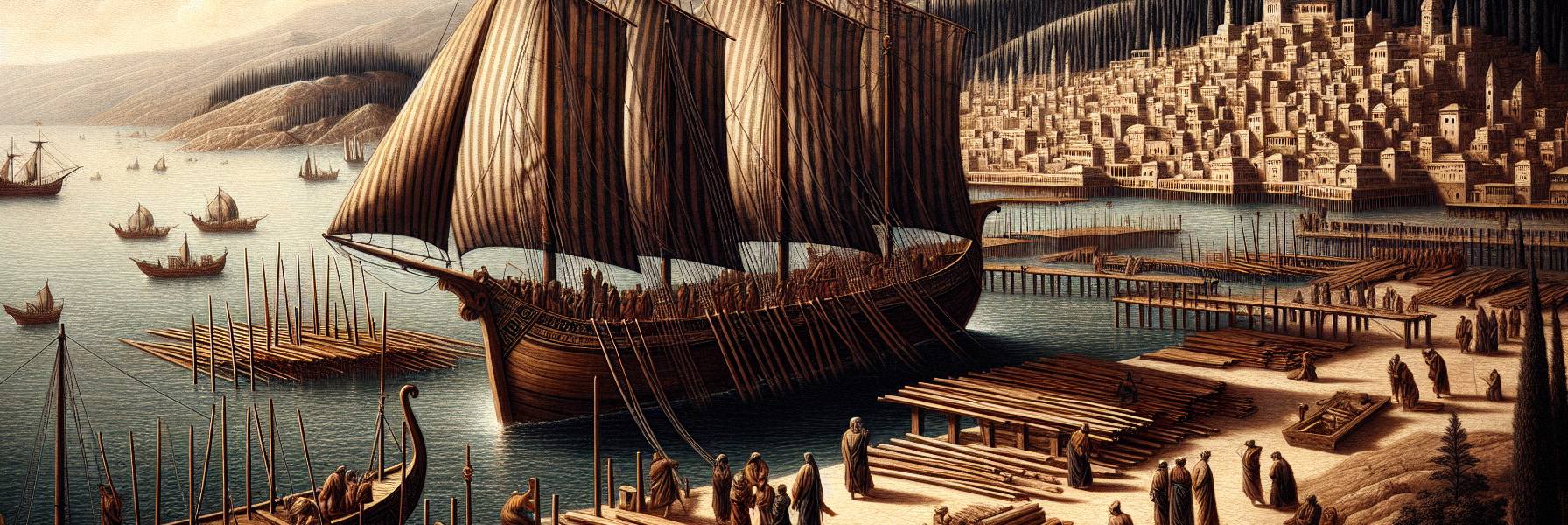 海風帶著鹽與遠方的氣息,日夜吹拂著推羅的島城。這城不像是從土地裡生長出來的,倒像是從深藍的海水中浮起的一座輝煌的夢。人們說,是眾水的神祇親手將它托出海面。它的城牆,是拍岸浪花凝結成的堅固白沫;它的屋宇,是晨曦為海浪鍍上的那層金邊。推羅人自己卻知道,這夢的根基,是杉木、是香柏木、是精巧無比的榫卯,是從黎巴嫩高山上採下的、帶著松脂清香的榮耀。