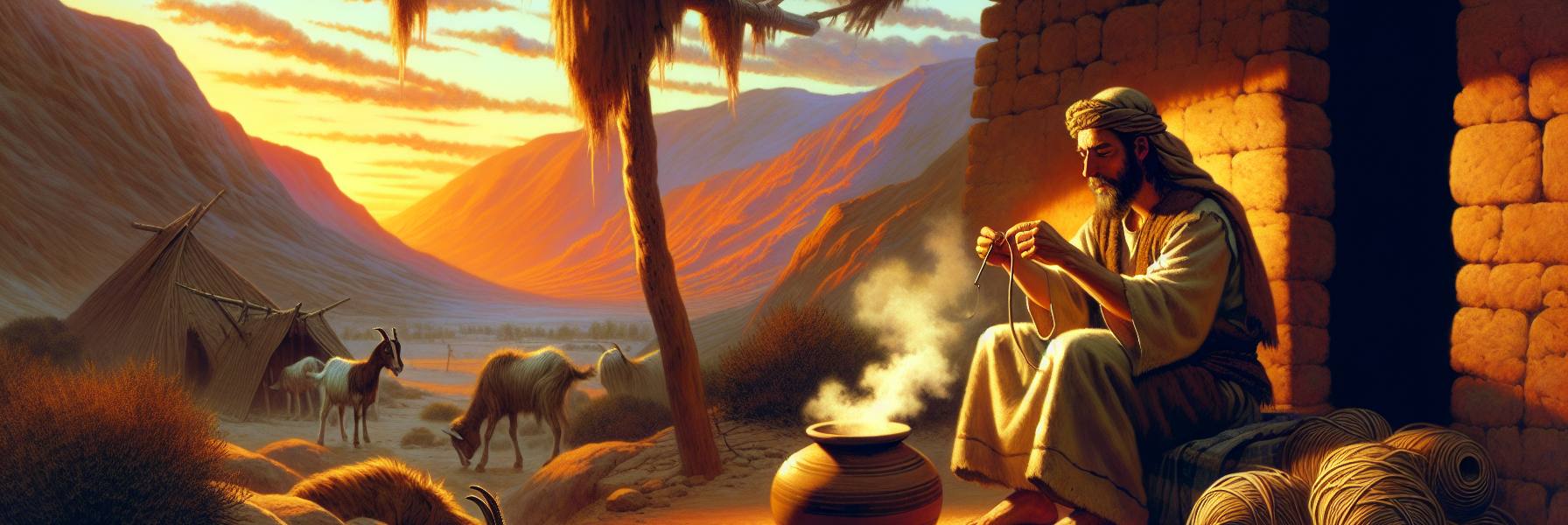 山谷里的晨雾还没散尽,乌利就已经赶着那五只母羊出了石墙围成的院子。羊蹄踩在露水打湿的小径上,发出细碎的声响。他是去年春天跟着商队来到这以色列人营地的,一个寄居的外族人,凭着祖传的手艺,用橄榄木给各家各户做臼、做轭,换来这片坡地下方一块栖身的角落和这几只羊。