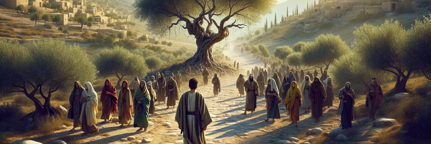 那是个灰尘扑扑的早晨,橄榄山的轮廓在渐亮的天光里显出一种沉闷的青色。耶稣在村子外头站住了,叫我和约翰去前头那家,说:“你们进伯法其的时候,会看见一匹驴驹拴在那里,是从来没有人骑过的。把它解开牵来。” 他说话时眉头微微收着,不是发愁,倒像是心里揣着一件极重的事,连带着周遭的空气都沉了。我和约翰对望一眼,都没多问,只闷头往坡下走。