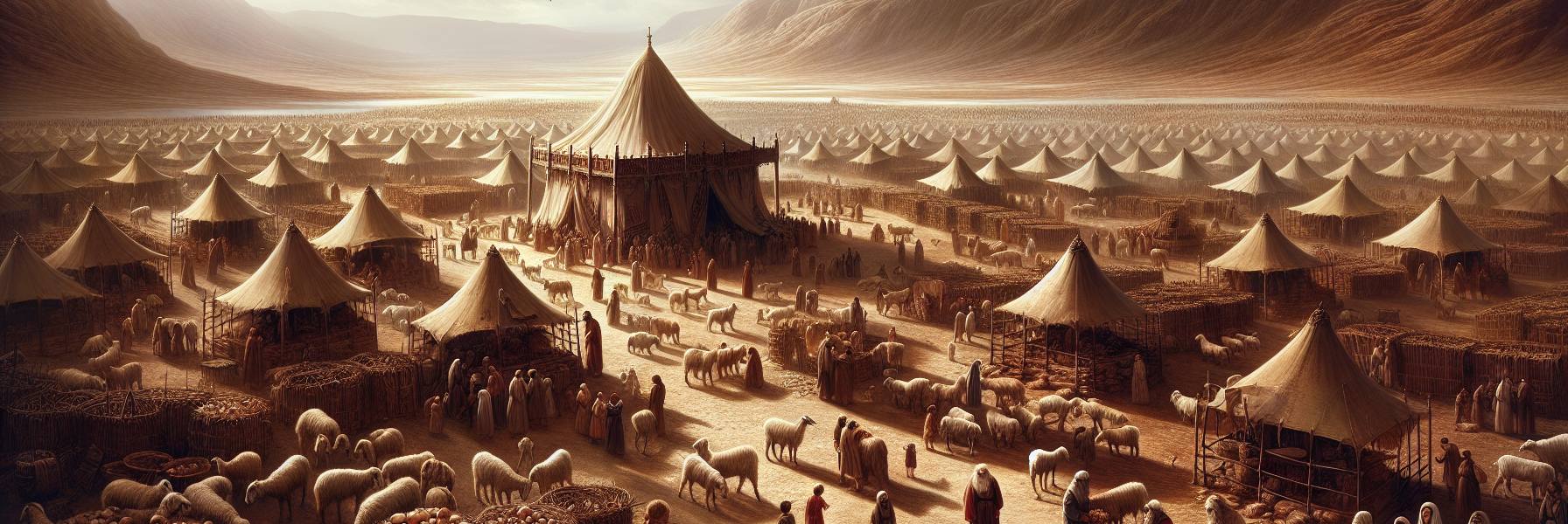 旷野的风是干燥的,带着细沙,吹过西奈山脚下那片庞大的营盘。会幕立在营地的正中央,皮革与细麻布的帐顶在午后的阳光下,泛着一层枯草般的淡金色。帐前的铜祭坛早已冷了,早晨的燔祭烟迹早已散尽,只有一股淡淡的、混合了香料与炭火的味道,还萦绕在空气里,像一种无声的提醒。