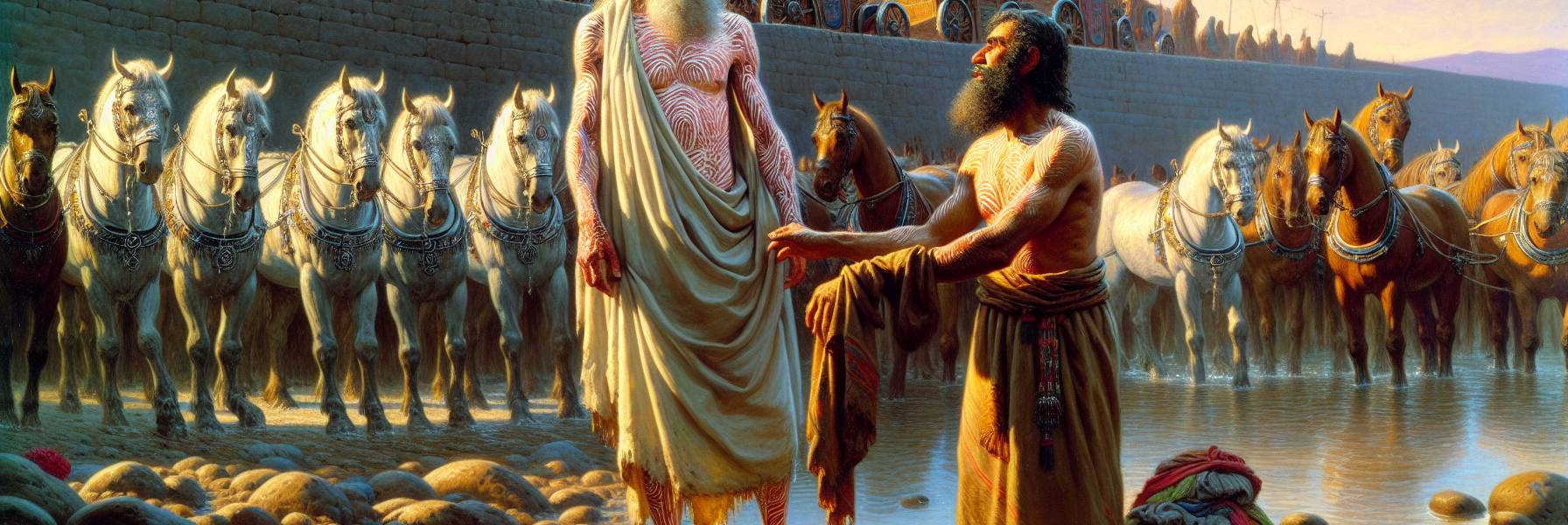 乃缦的车骑停在了以利沙居所门前,那不过是一处寻常的屋舍,墙泥斑驳。他等着先知整衣出迎,或许还有复杂的仪式、低声的祈祷、神圣的膏抹。但门只开了一条缝,一个仆人模样的出来,传达了主人的话:“你去在约旦河中沐浴七回,你的肉就必复原,而得洁净。”