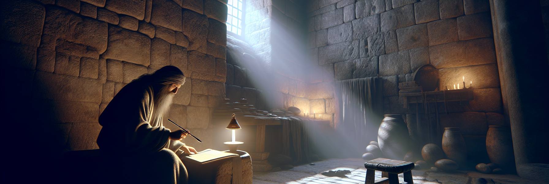 他没有走向燔祭坛,也没有去找祭司。他拐进了圣殿外院一个偏僻的、石墙环绕的角落,那里通常只有几个安静的祈祷者。他面朝至圣所的方向跪下,石板的热度透过膝盖传来。起初,干涩的喉咙发不出声音,只有胸腔里浊重的喘息。他闭上眼,不再编织言辞,不再考虑后果,只是将那块堵了七个月的、名为“罪”的巨石,用力从心里推出来。
