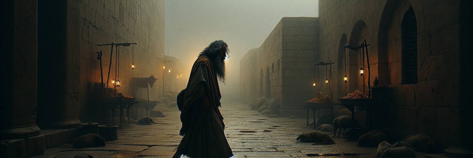 夜完全黑了。在耶路撒冷城西一处简陋的居所内,玛拉基——这个名字意为“我的使者”——却无法安眠。他没有点灯,坐在漆黑的屋子里,只有窗外一缕微弱的星光,勾勒出他瘦削肩膀的轮廓。白日里的景象在他脑中翻腾:那瘸腿的羊羔被拖上台阶时无助的哀鸣;祭司漫不经心的手势;百姓交头接耳、计算得失的低语;还有祭坛上冲天的烟火后面,那种巨大的、几乎令人窒息的……沉默。