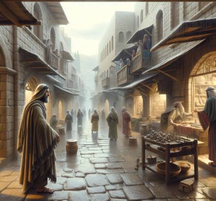 人陸續來了。他們踏著長草走近,鞋上還帶著田間的泥土。有人剛剛放下手中的木工工具,有人從葡萄園直接趕來,袍子邊上沾著新榨葡萄汁的深紫色漬痕。他們彼此低聲交談,目光不時投向獨自立在那裡的約書亞。他們看見的是一個背微微佝僂的老人,白髮稀疏,被傍晚的風吹得有些凌亂。但當他轉過身,那雙眼睛依然清澈,像經過漫長雨季後,山澗深處的潭水。